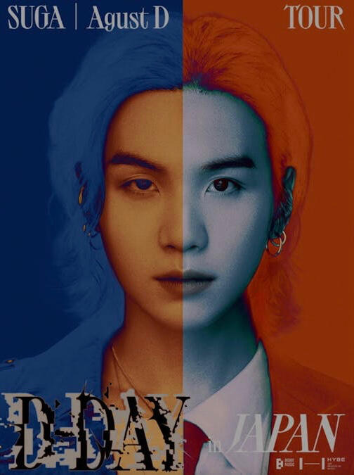 'AGUST D' is SUGA's alter ego and releases solo music using this name. Different from his BTS side AGUST D explores the more raw and darker concept of who SUGA is. AGUST D comes from SUGA backwards, and the D comes from D-Town, referring to Daegu, SUGA's hometown. On April 21, 2023 he made his solo album debut with D-Day and became the first member to set off on his own solo tour.